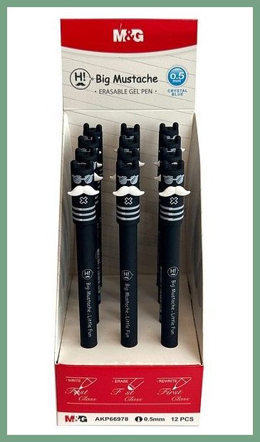 Geelikynä Kissan Viikset musta Pyyhittävä 0,5 mm sininen muste. Tämän erinomaisen kynän toimituksen kesto verkkokaupasta tilattuna 1-2 päivää. Ominaisuudet: Pyyhittävä geelikynä kumilla kynän päässä. Söpö kissahahmo viiksillä. Pehmeä ja tarkka kirjoitusjälki. Viivan leveys: 0,5 mm. Musteen väri: sininen (Crystal Blue). Rungon väri: musta. Pakkaus 12 kynän kartonkidisplay (valmis myyntiteline). Geelikynät myydään 12 kappaleen erissä, laatikossa on 864 kynää. Täsmällinen kuljetuspalvelumme toimittaa geelikynän toimitusosoitteeseen klo 8 - 15 välillä. Helsinki, Turku, Tampere... siis minne tahansa Suomeen.
