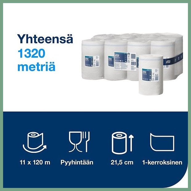 Tork Advanced Mini -vetopyyhe M1 1-krs. valkoinen 120m 11rll. Se on erinomainen puhdistusväline, jonka toimitus hoidetaan heti kun sitä saapuu varastoon (n. viikko). Tork Run Out -ilmaisin auttaa suunnittelemaan rullien vaihdot, välttämään keskeytyksiä sekä niiden aiheuttamaa ärsyyntymistä Ihanteellinen käsien pyyhintään ja vähemmän likaisille pinnoille Erityisen hyvä lasin puhdistukseen ? ei jätä nukkaa eikä jälkiä pintaan Voidaan käyttää yhdellä kädellä, mikä tekee siitä helppokäyttöisen Tuotannossa ei synny lainkaan hiilidioksidipäästöjä [Maakaasun korvaaminen kestävällä biokaasulla normaaleissa toimintaolosuhteissa (pois lukien esimerkiksi rikkoutumiset ja käynnistys) ja sertifioidun, uusiutuvan sähkön käyttäminen Lilla Edetin tehtaalla.]. Nopea kuljetuspalvelumme toimittaa tilauksen toimitusosoitteeseen klo 8 - 15 välillä. Turku, Oulu, Helsinki... toisin sanoen kaikkialle Suomeen.