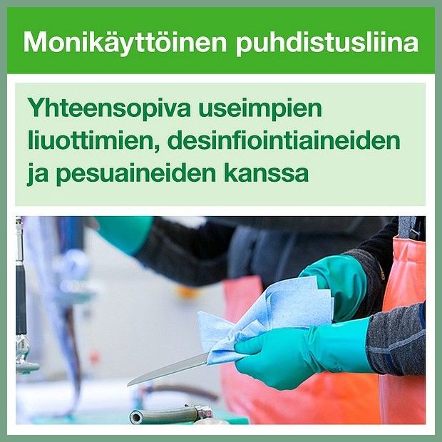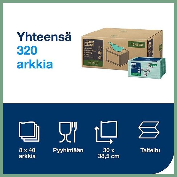 Tork-siivousliina W8 vihreä 40kpl. Tämän erinomaisen siivousvälineen toimituksen kesto verkkokaupasta tilattuna 1-2 päivää. Monet siivousliinat repeytyvät toistuvassa käytössä, mutta Torkin vahva ja imukykyinen siivousliina kestää useamman käyttökerran repeytymättä, vähentäen jätettä ja kuluja. Käyttämällä värikoodattuja siivousliinoja eri siivoustehtäviin estät myös bakteerien leviämisen paikasta toiseen. Valitse värien joukosta sininen, vihreä, keltainen ja punainen puhdistusliina. Voit käyttää liinoja useimpien liuottimien, desinfiointi- ja puhdistusaineiden kanssa, ja mukauttaa niiden käytön helposti osaksi omia siivousrutiinejasi. Yhteensopiva Tork W8 Small Pack -annostelijan kanssa. Tuotetta myydään pakkauksittain. pakkauksessa on 40 kappaletta. Täsmällinen sopimuskuljetuksemme toimittaa lähetyksen toimitusosoitteeseen työpäivän aikana (8 - 15). Kuopio, Turku, Helsinki... toisin sanoen kaikkialle Suomeen.